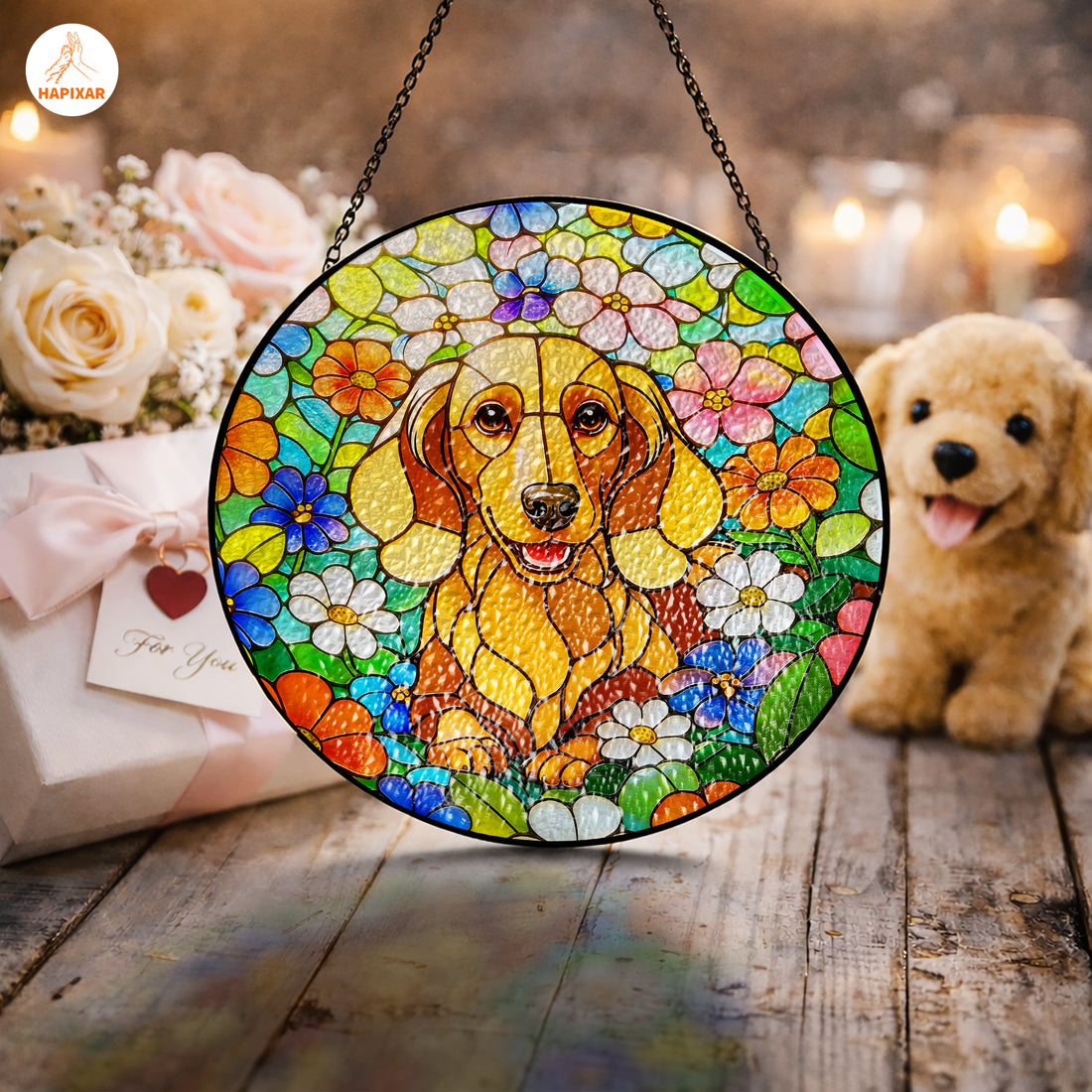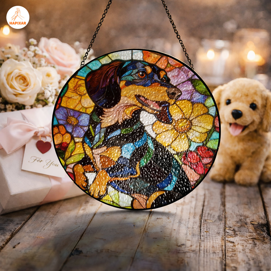 Floral Dachshund Glass Suncatcher – Stained Glass Window Hanging Gift for Dog Lovers