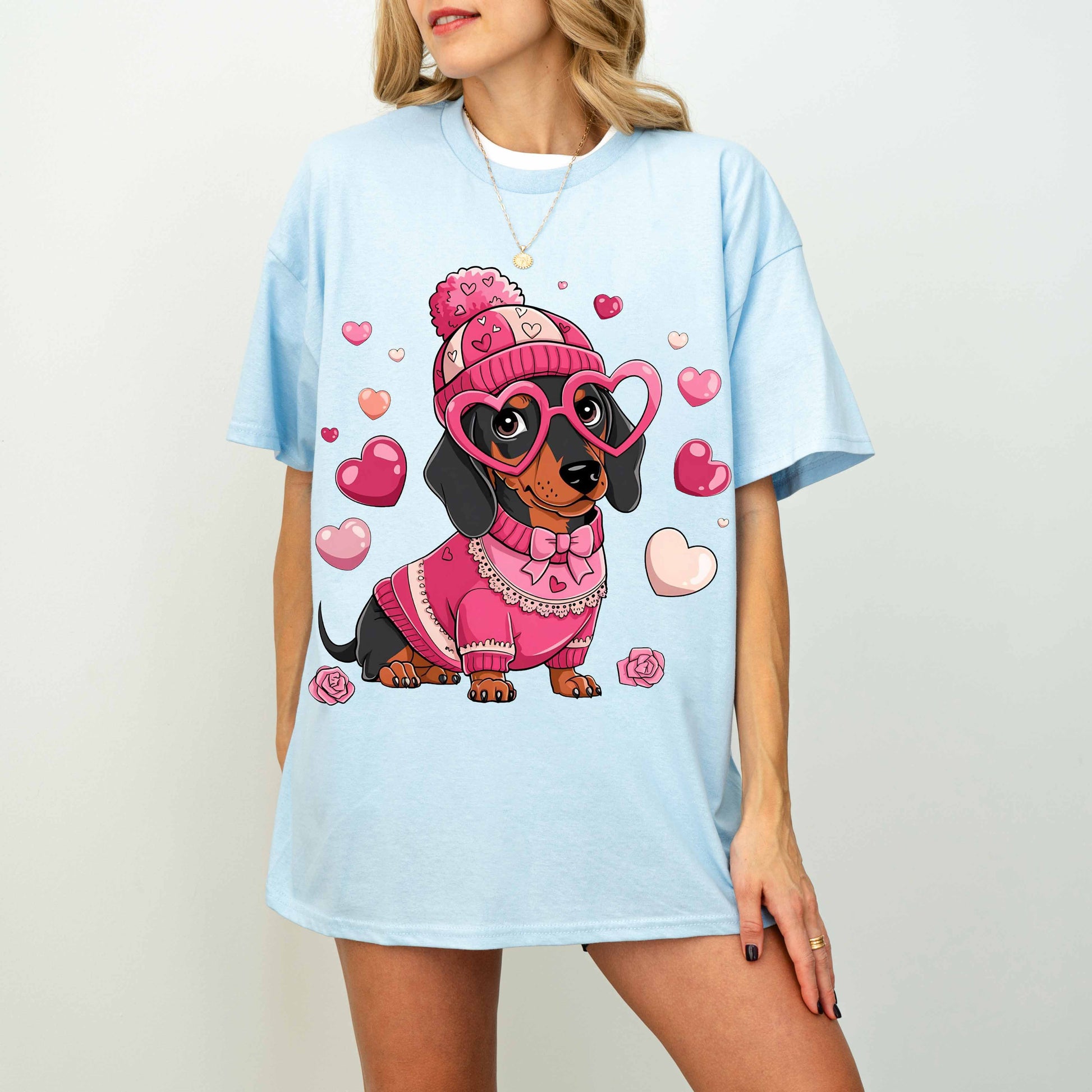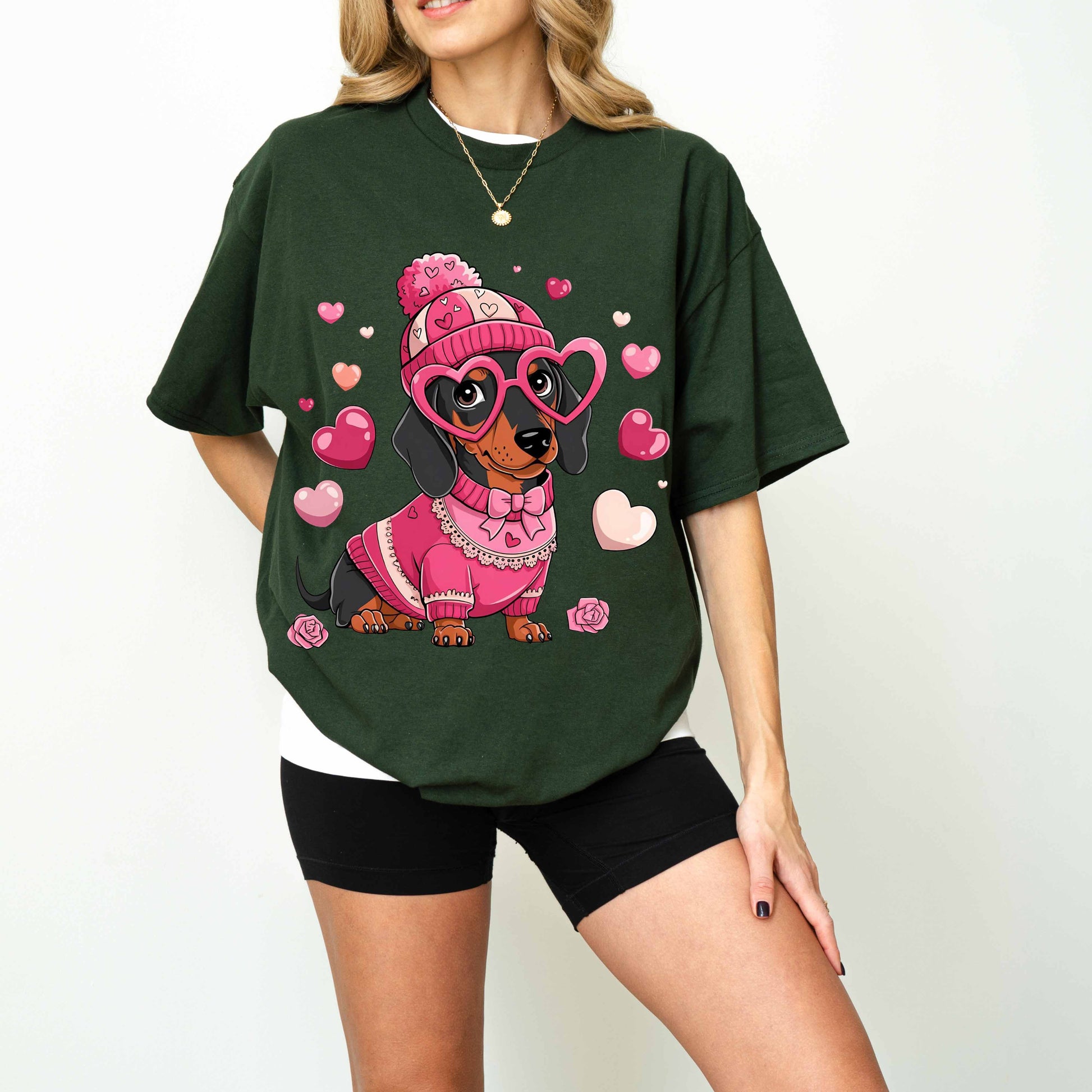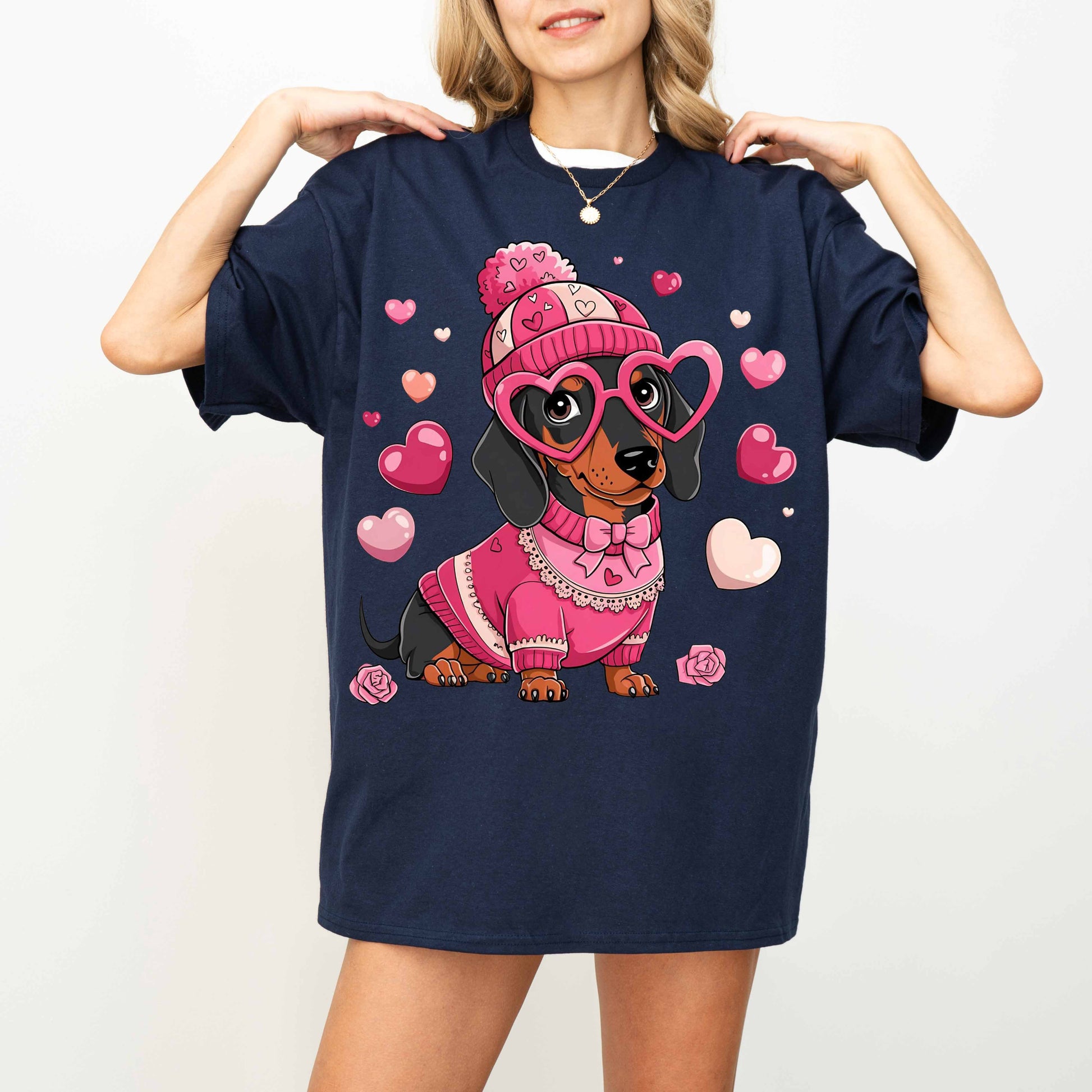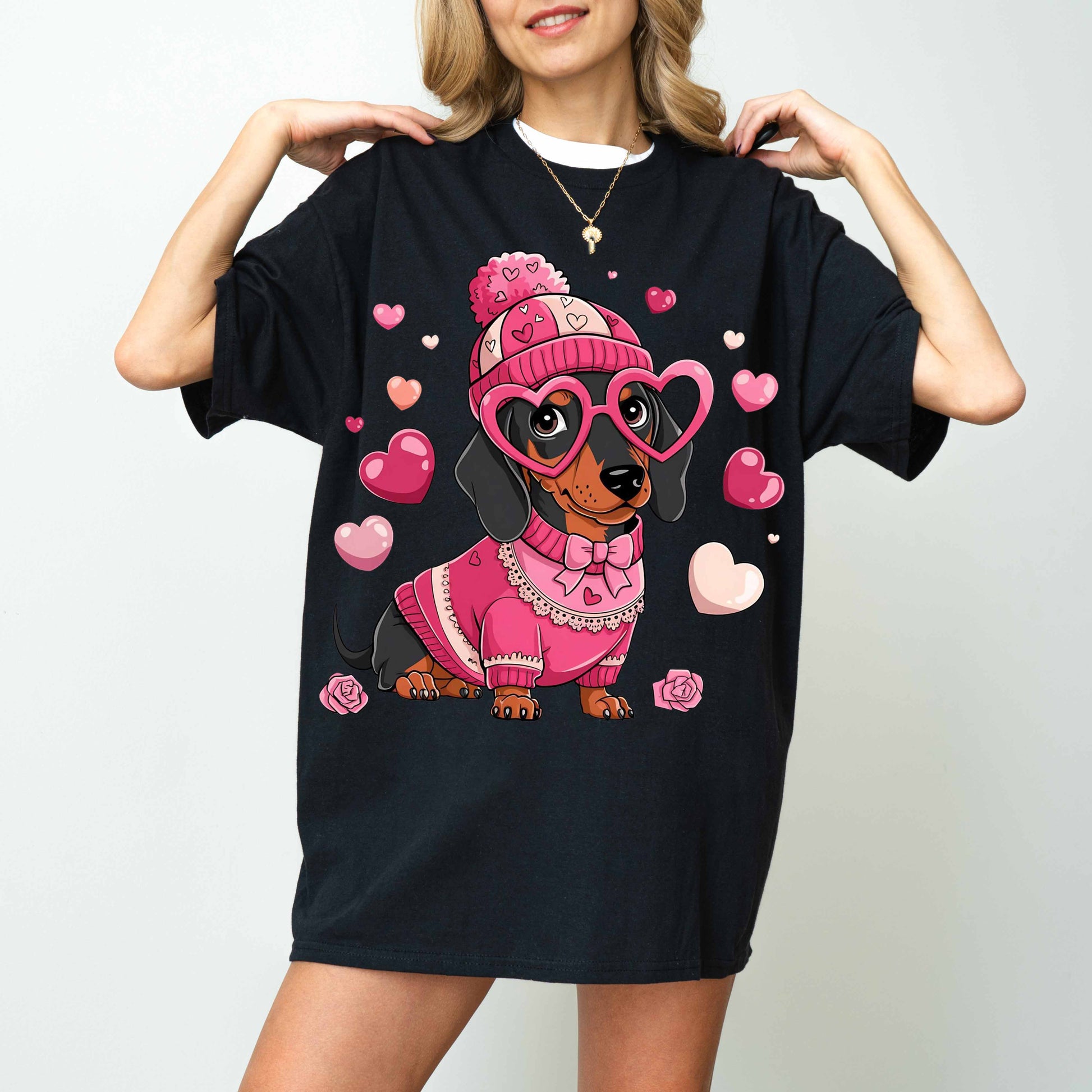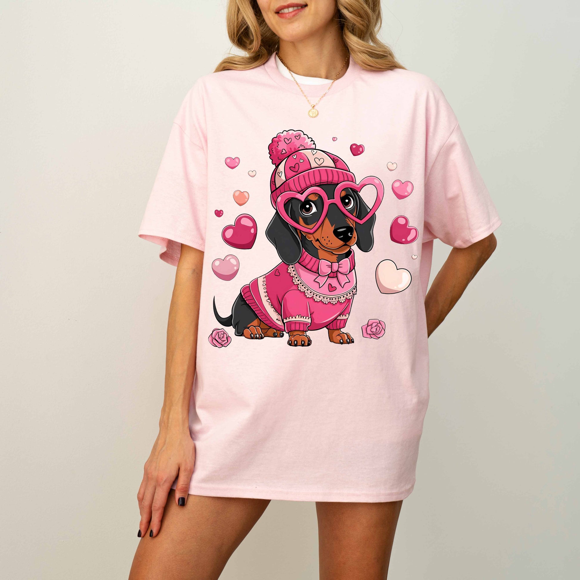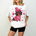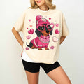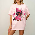 Cute Pink Dachshund Dog Mom T-Shirt with Heart Glasses