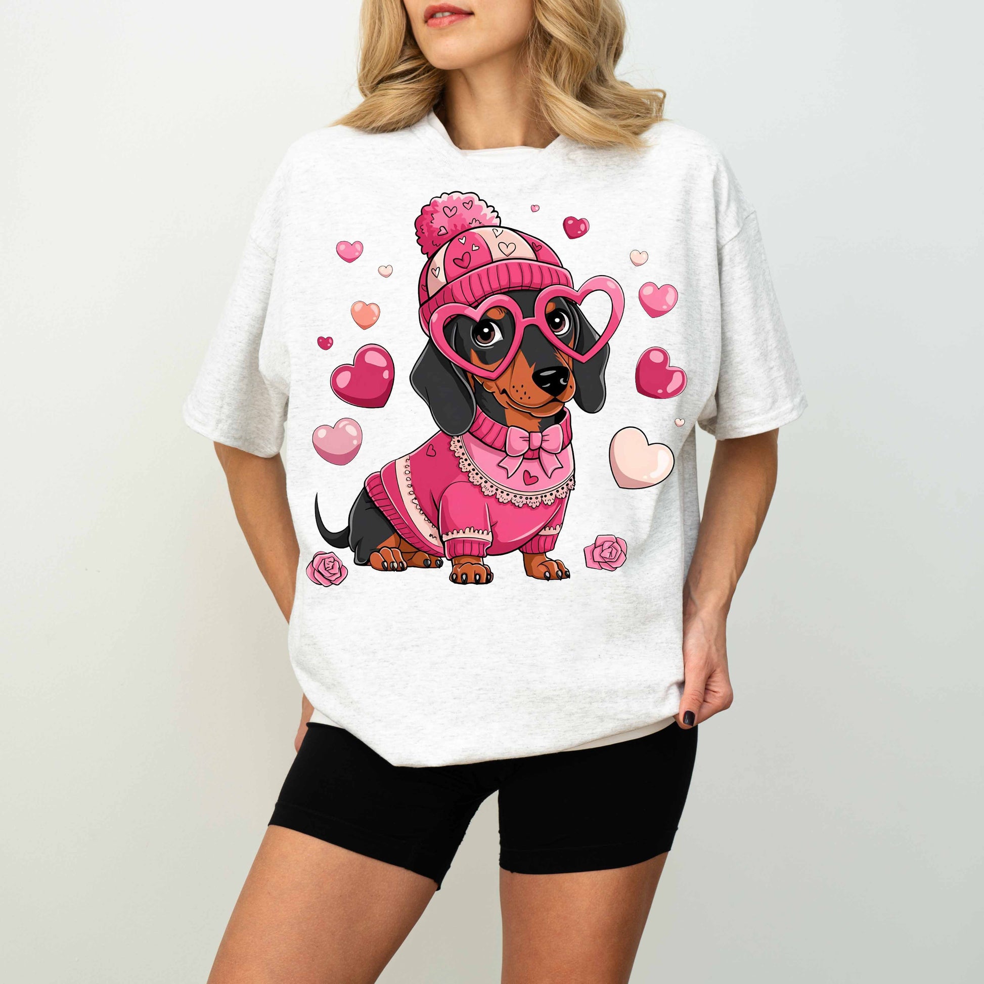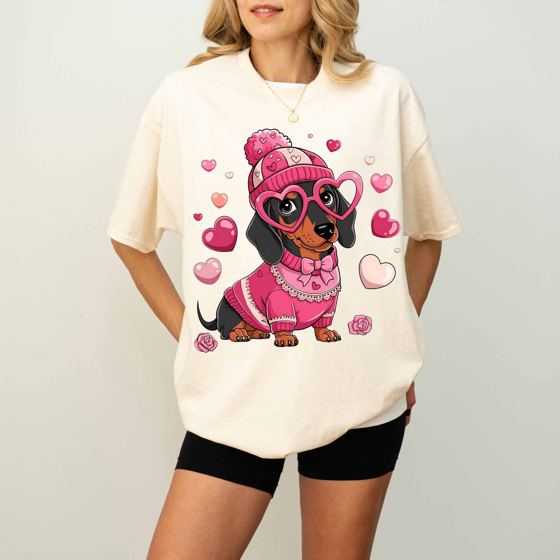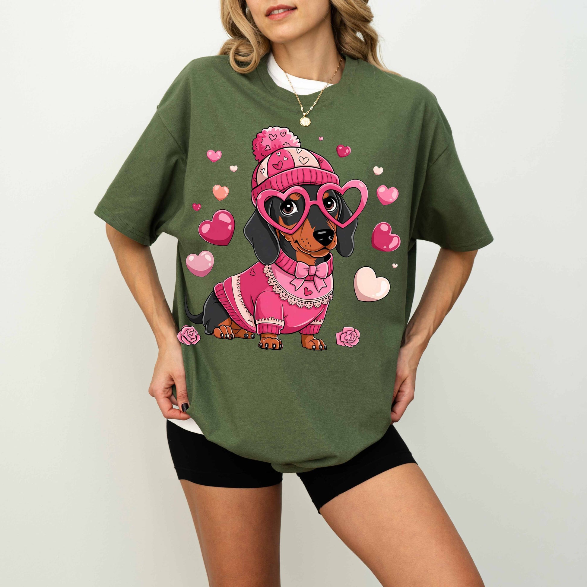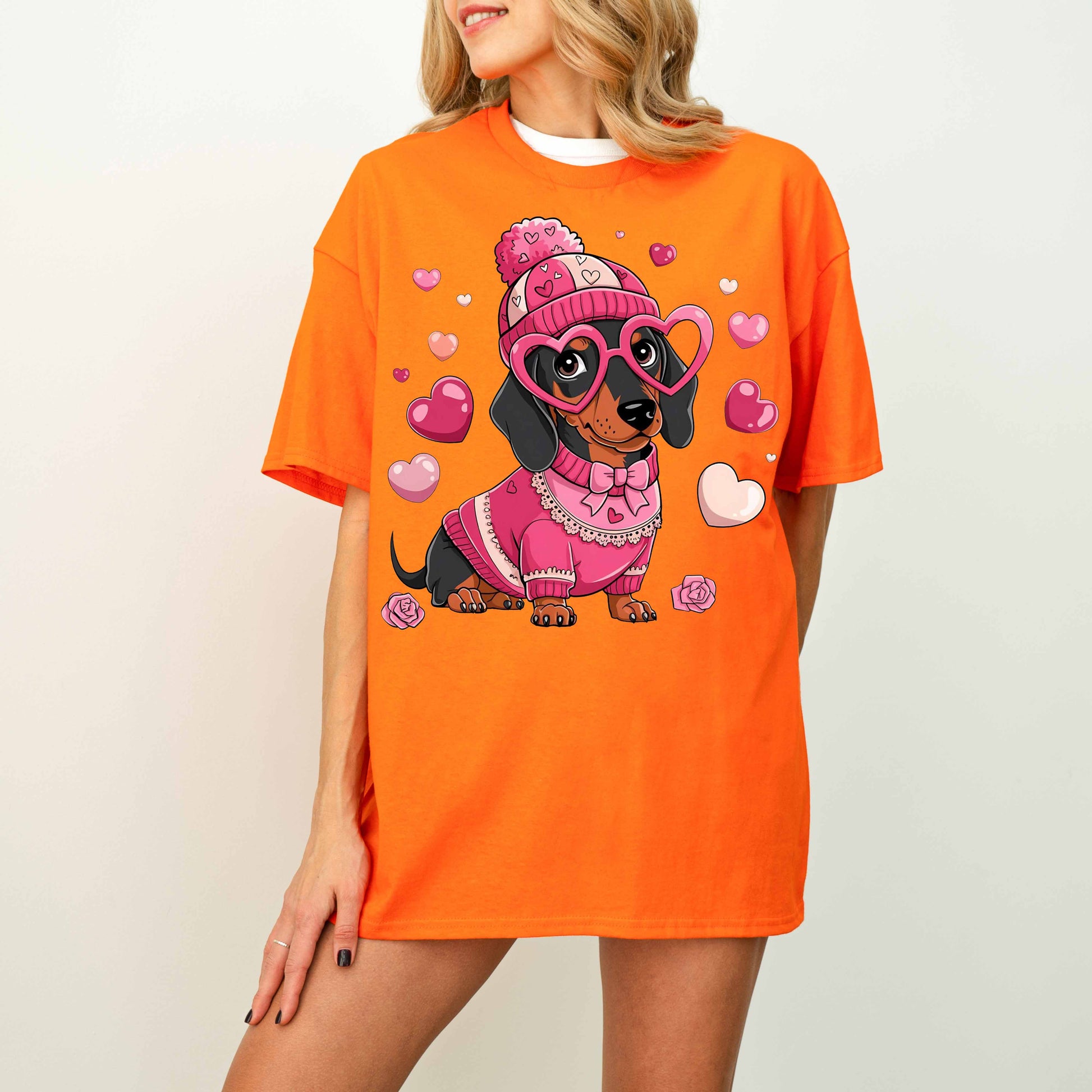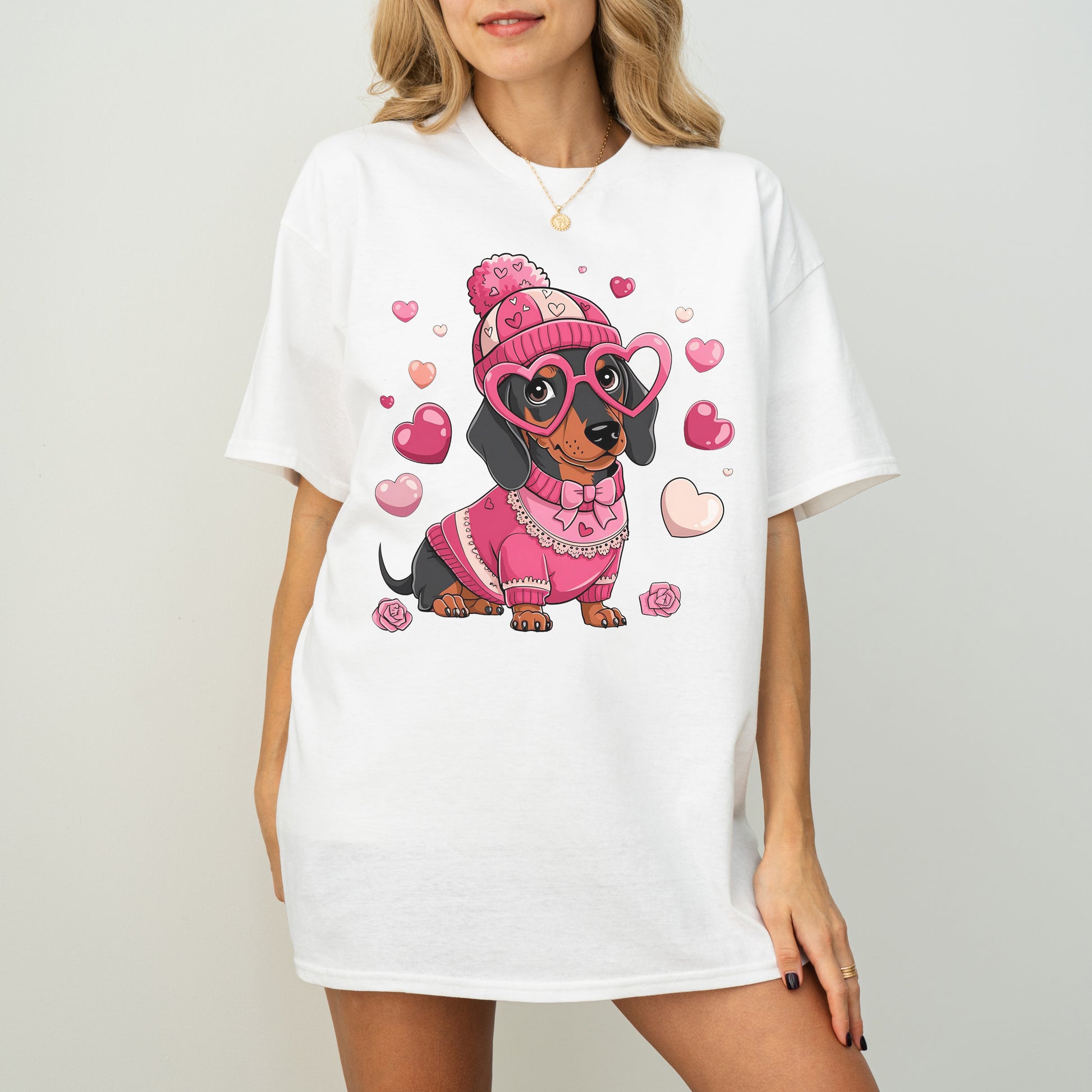 Cute Pink Dachshund Dog Mom T-Shirt with Heart Glasses