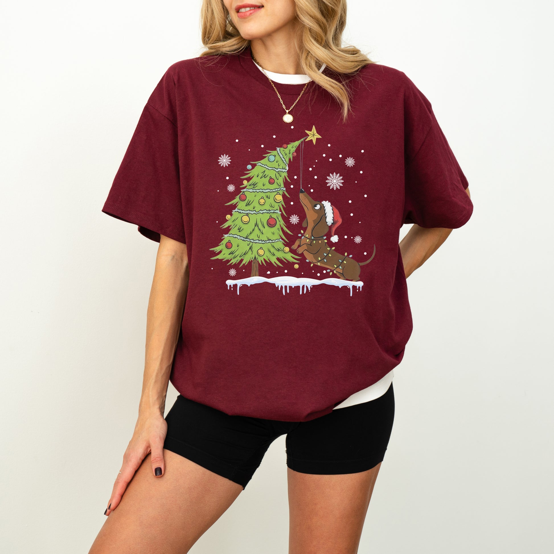 This Dachshund Shirt captures the adorable spirit of Christmas with a playful wiener dog decorating the tree. Perfect for dog lovers who want festive charm and cute doxie vibes.