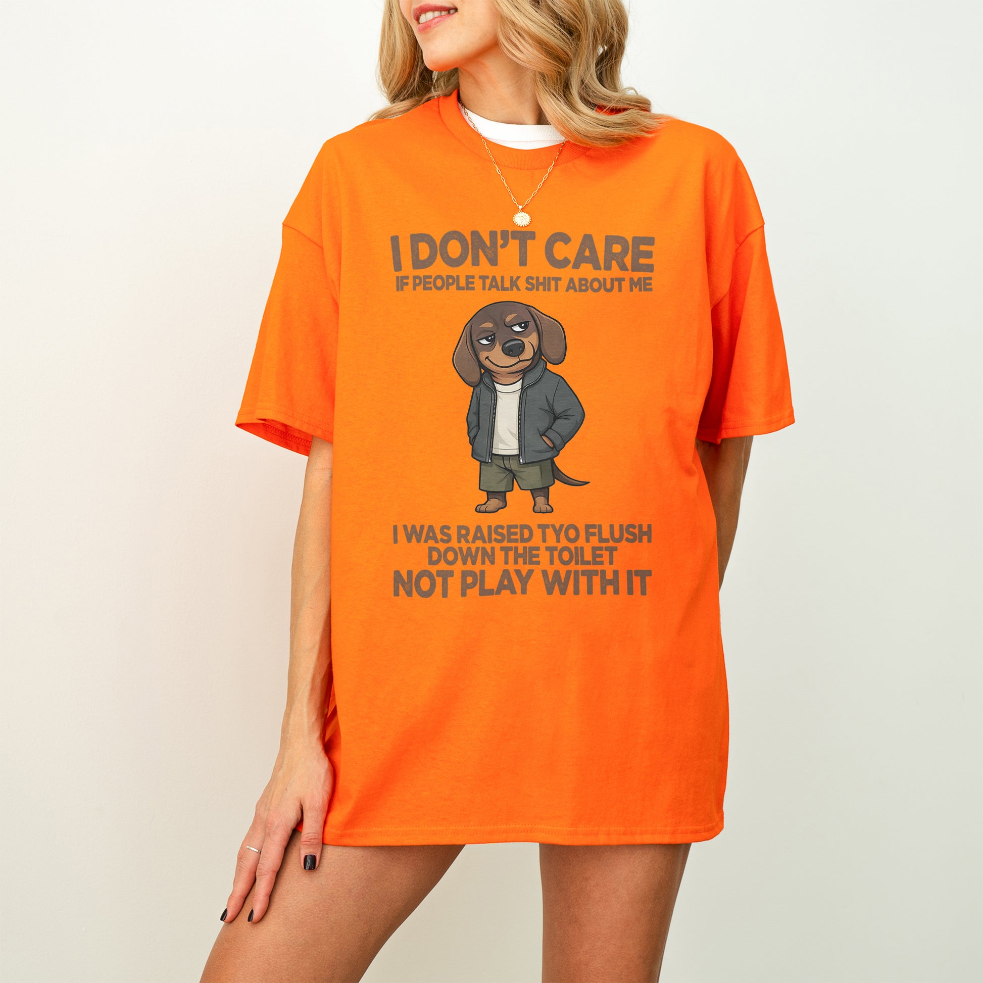 This bold Dachshund shirt is made for people who truly don’t care about gossip, opinions, or unnecessary drama. Featuring a smug, confident wiener dog with hands in pockets and zero patience for nonsense, this design says exactly what you’re thinking — without you having to say a word.