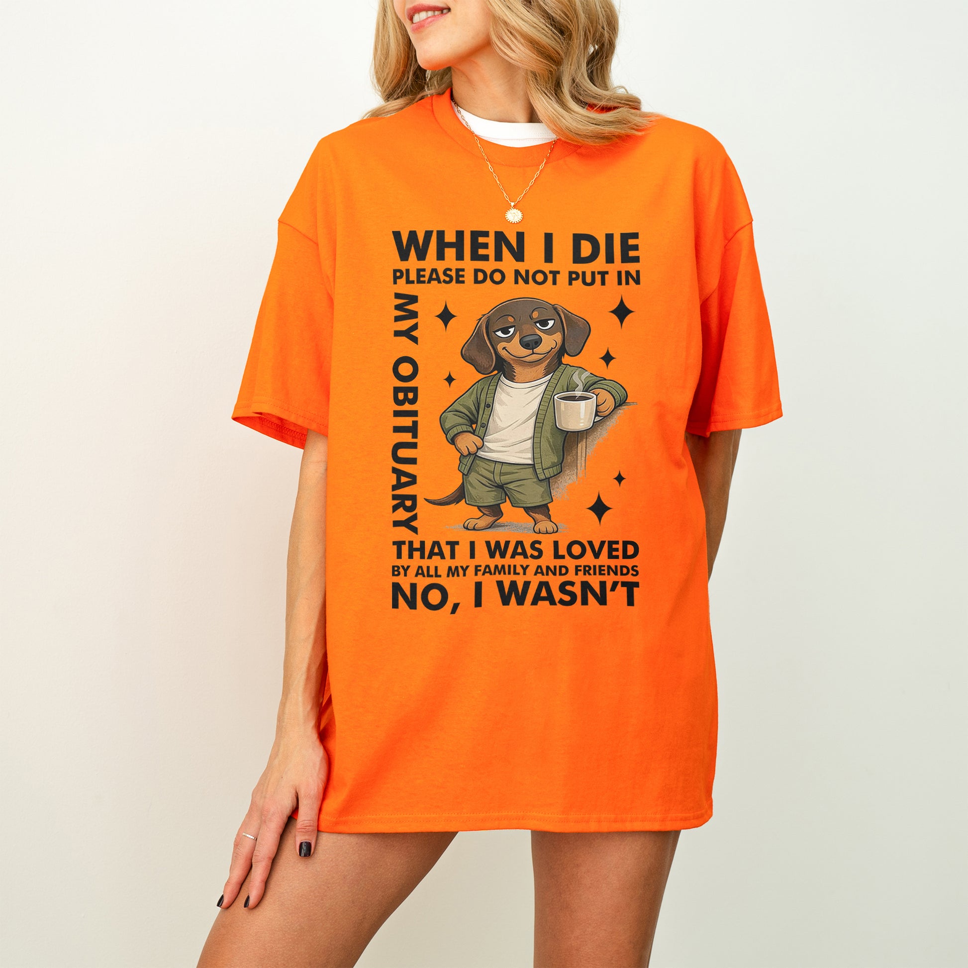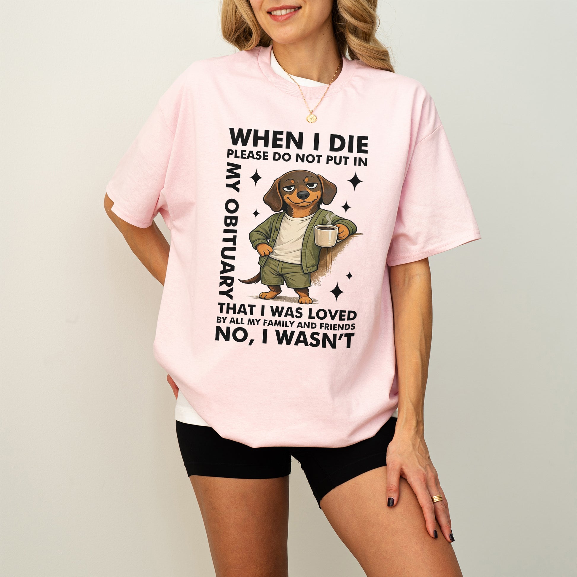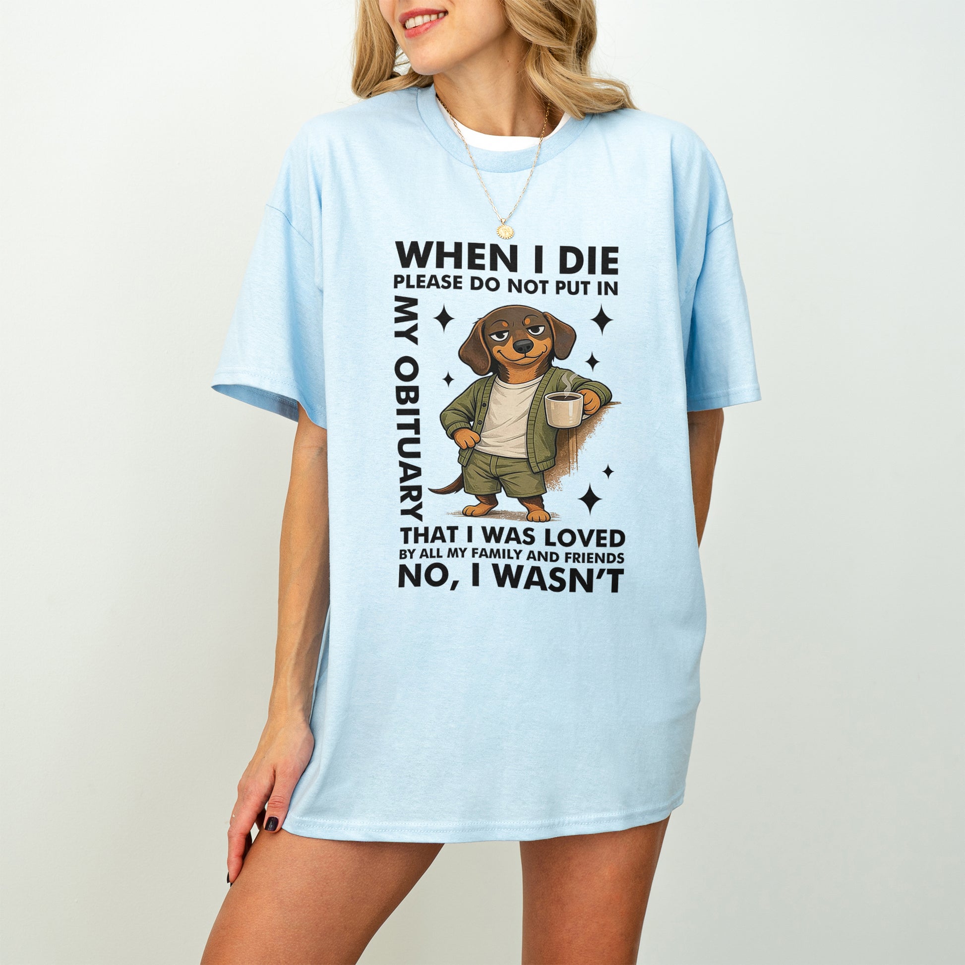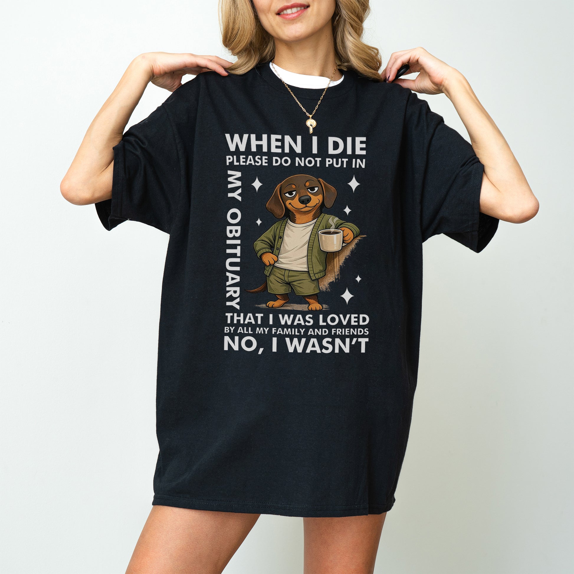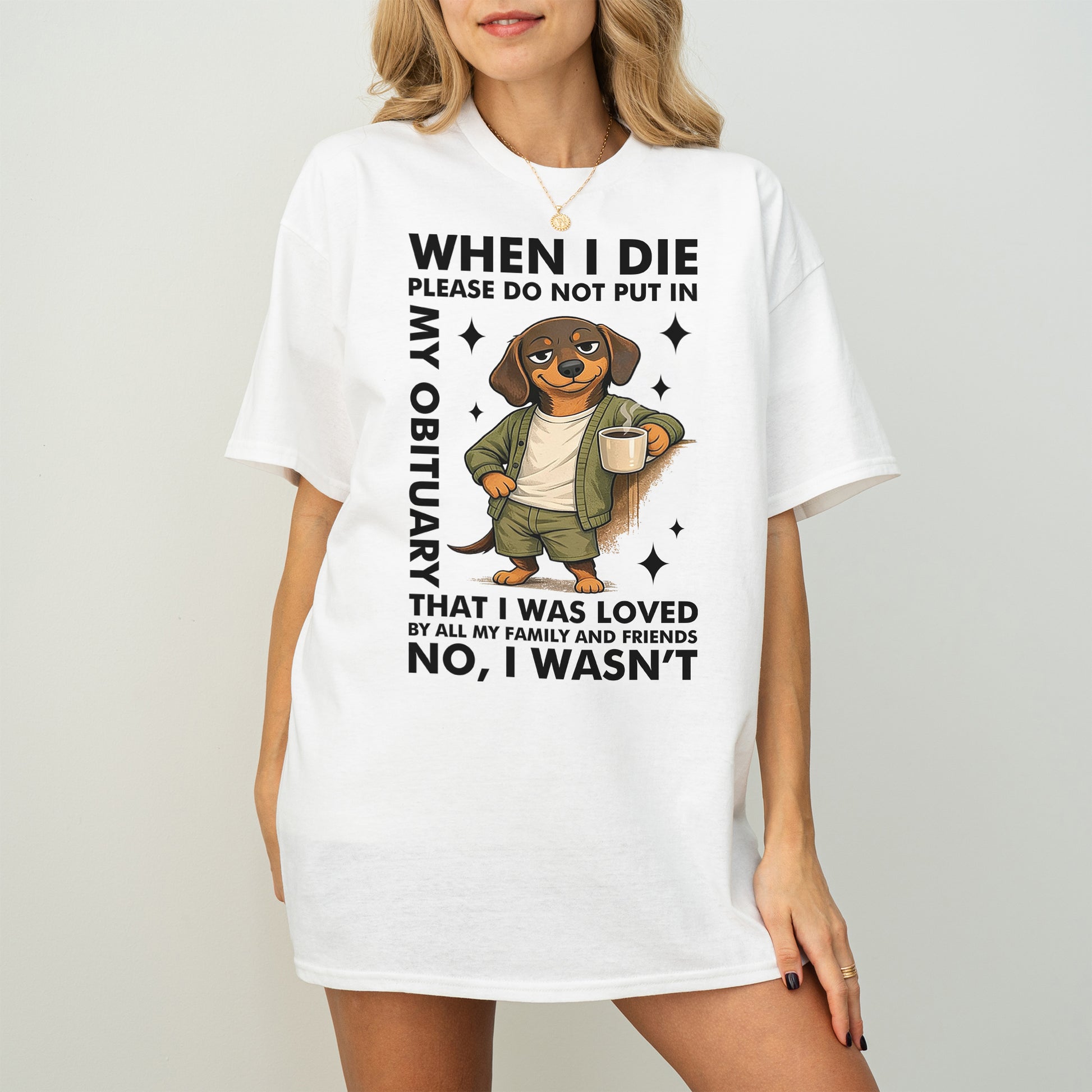 This When I Die Dachshund Shirt features a smug, coffee-holding wiener dog paired with brutally honest humor that says what most people are thinking — but would never put in writing.